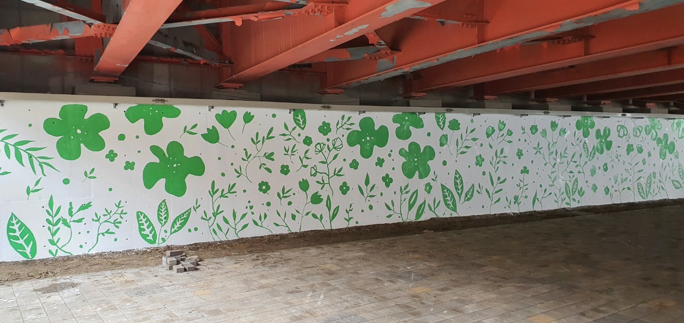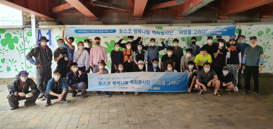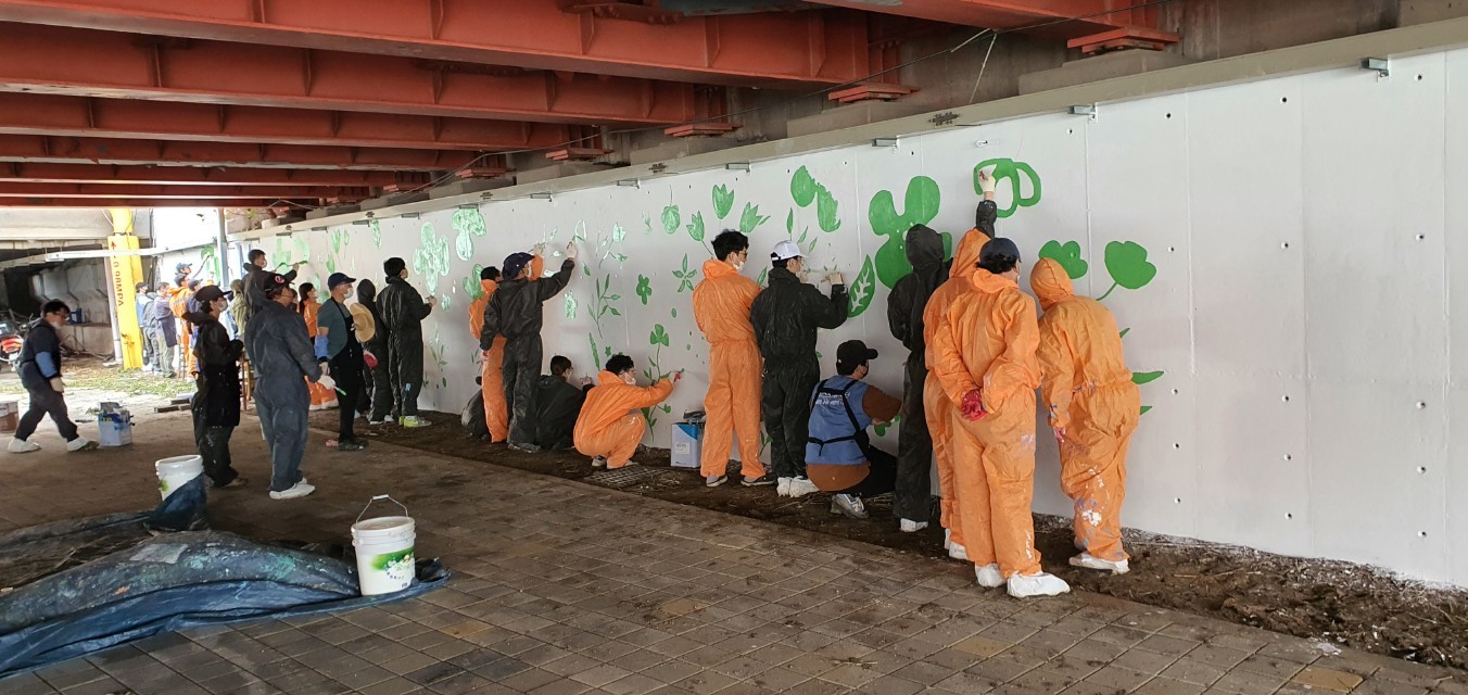 일시:2020년9월12(토) 08시~16시 장소:형산다리교각 코로나19와 비가많이 내리는귿은날씨에도 봉사단원및가족들이 일일이 발열체크와 마스크를 하고 하나둘씩모여 40여명이 참석하여 8시간의 작업끝에 시멘트 벽이였든곳이 아름다운 쉼터로 바꼈습니다. 10년전 POSCO내의 협의회에서 회사내 공장들의 진입하는 공간들이 너무 삭막하고 시멘트가 보기싫다고 생각하여 벽에 채색을 하여 아름답고 모든직원들에게 밝게생각할수있는 공간을 만들어보자는 취지로 시작하여 활동을 하면서 노하우가 쌓였는데 5년전에 회사내 "벽화봉사단"을 발족을시켜서 회사내뿐만아니라 지역사회까지 확대를 하자고해서 발족되었고.현재 단원수는 140 여명정도입니다.
