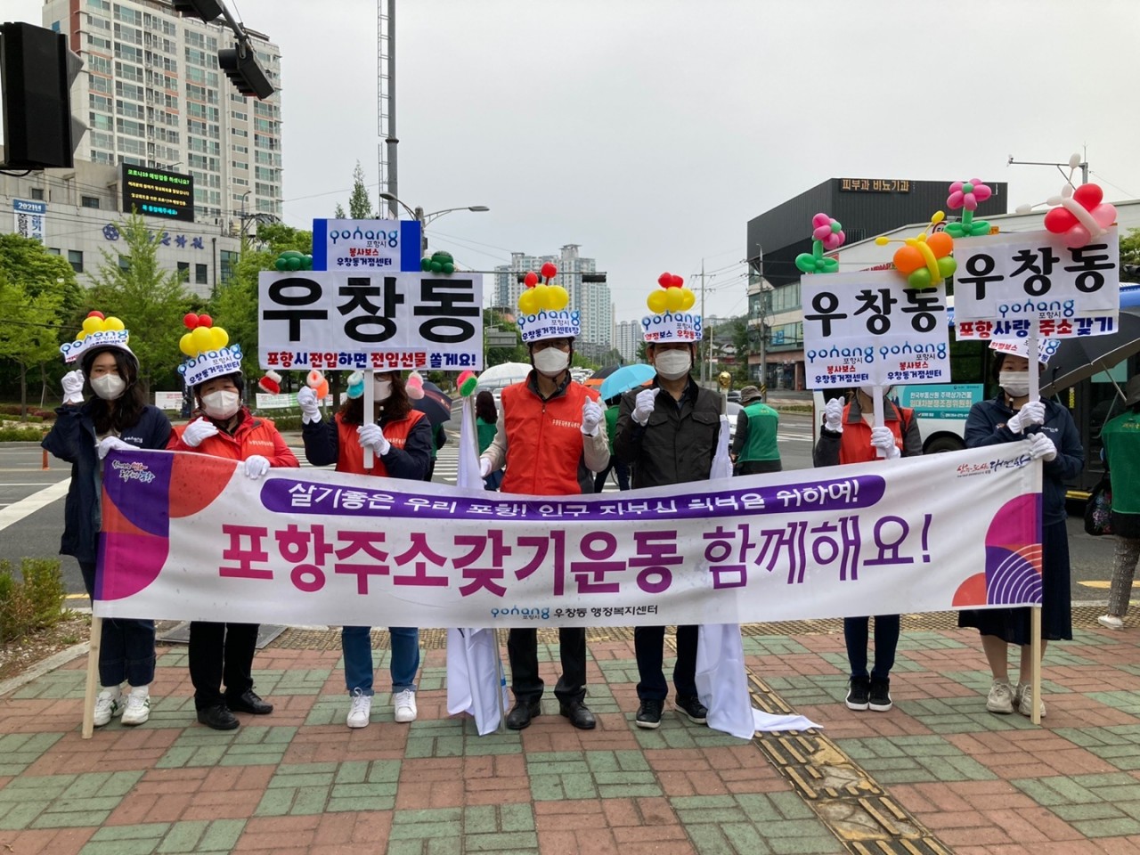 - 일시 : 2021. 4. 29.(목) 07:30~08:30 - 장소 : 우창동 행정복지 센터, 우현사거리 - 대상 : 우창동거점자원봉사센터 - 내용 : 약한 비가 내리는 가운데 우창동에서는 이른 아침 내고장주소갖기 캠페인을 진행하였다. 캠페인 참석자는 이창준 동장과 우창동행정복지센터 직원, 우창동거점센터장과 박종선 사무국장을 비롯한 단원들이 참석한 가운데 우창동 내 시민들의 교통량이 가장 많은 우현사거리에서 진행되었다. 이날 캠페인은 봉사단이 직접 만든 형형색색의 아름다운 고무풍선아트 장식을 머리에 쓰고 이색적인 퍼포먼스를 연출하며 출근길 시민들께 즐거움과 포항 사랑의 지름길은 내고장 포항주소 갖기로 시작된다는 인식을 새롭게 각인시키는 계기가 되었다. (사)포항시자원봉사센터 홍보기자 정순택 |