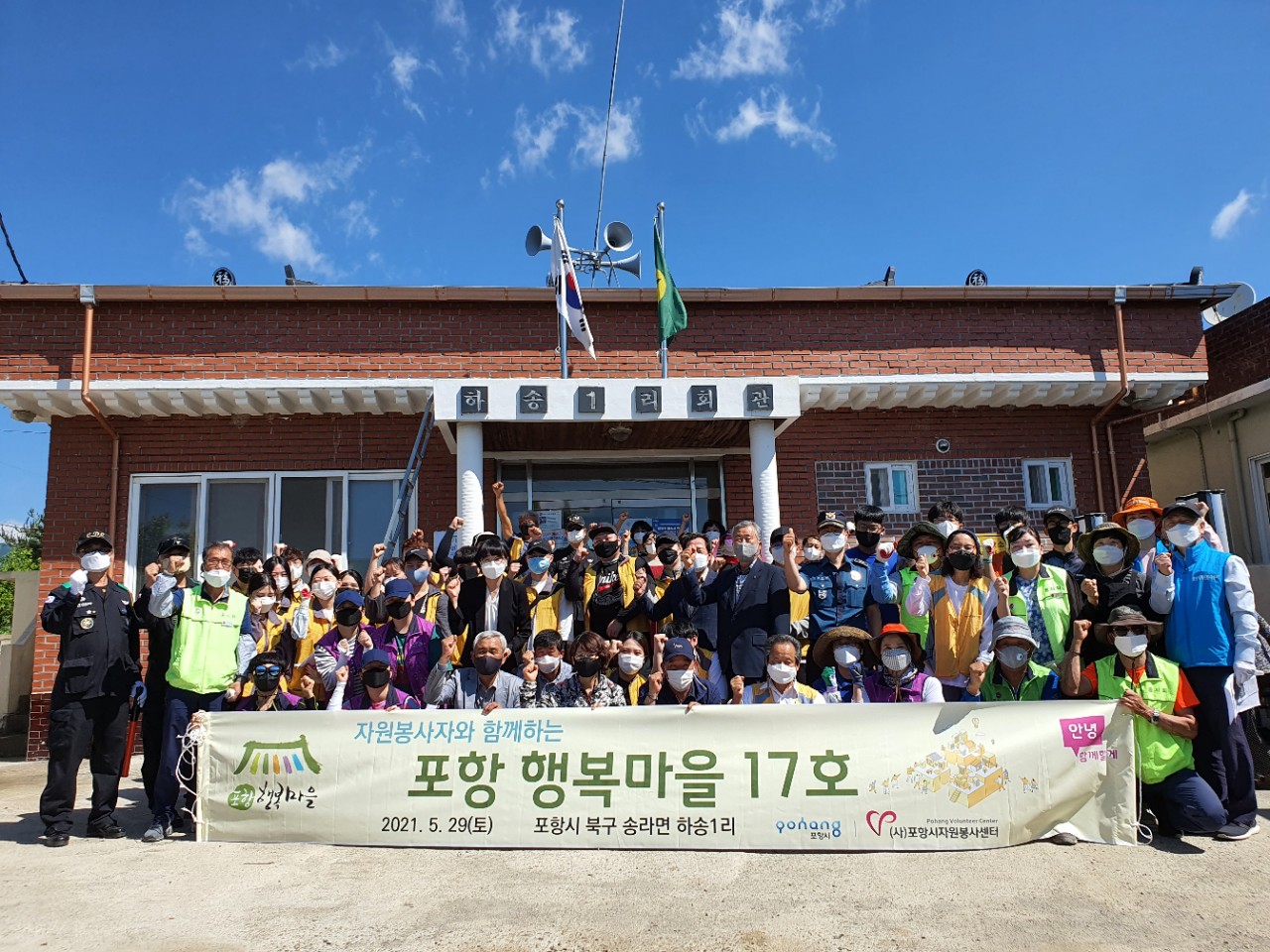 - 일시 : 2021. 5. 29.(토) 9:20~16:20 - 장소 : 포항시 북구 송라면 하송1리 - 대상 : 가위사랑, 둥지회, 부학사랑봉사회, 사랑그리다, 미소짜장면봉사회, 수도방위사령부 포항전우회, 위덕대학교 로타렉트, 포항문화봉사단, 포항시자원봉사센터 홍보단, 형산강환경지킴이 - 내용 : 돋보기맞춤, 방충망수리, 마을회관 담장도색, 벽화그리기, 문화공연, 이미용, 자장면 나눔, 주차안전관리 맑고 화창한 오월의 마지막주 토요일 포항시 북구 하송1리에 포항 행복마을 17호가 탄생하였다. 이른시간부터 하송1리 마을회관에는 권광철이장님을 비롯한 많은 내빈분들이 참석해 행복마을 탄생을 축하해주었고, 그 어느때보다 많은 관심과 호응으로 시작부터 활기차고 생동감이 넘쳤다. 행복마을 탄생 때마다 함께해준 사랑그리다 봉사단과 돋보기 맞춤을 책임져준 부학사랑 봉사회, 방충망수리를 도와주신 둥지회 여러분들과 형산강환경지킴이 그리고 이.미용봉사를 해주신 가위사랑봉사회, 위덕대학교 로타렉트 이 모든분들이 한마음 한뜻이 되어 일사분란하게 움직였다. 이번에는 포항문화봉사단의 위안공연까지 펼쳐져 분위기가 한층 더 화기애애하였고, 미소짜장면봉사회에서 제공해 주신 자장면은 꿀맛이었다. 또 수도방위사령부 포항전우회에서 주차 및 안전관리까지 맡아 주셔서 모든 봉사자들이 편안하게 작업에 임할 수 있었다. 센터 담당자인 이윤정팀장은 "바쁘게 준비했는데 모든것이 잘 이루어져 다행이라며 도움 주신 많은 봉사자분들께 고마움을 전한다."라고 했다. 이와같이 많은 분들의 도움으로 하송1리에 행복마을 17호가 탄생 되었고, 앞으로 탄생할 18호 행복마을도 기대하며 사업이 더욱 더 발전하기를 기원해 본다. (사)포항시자원봉사센터 홍보기자 윤영희, 정순택, 최종갑 |