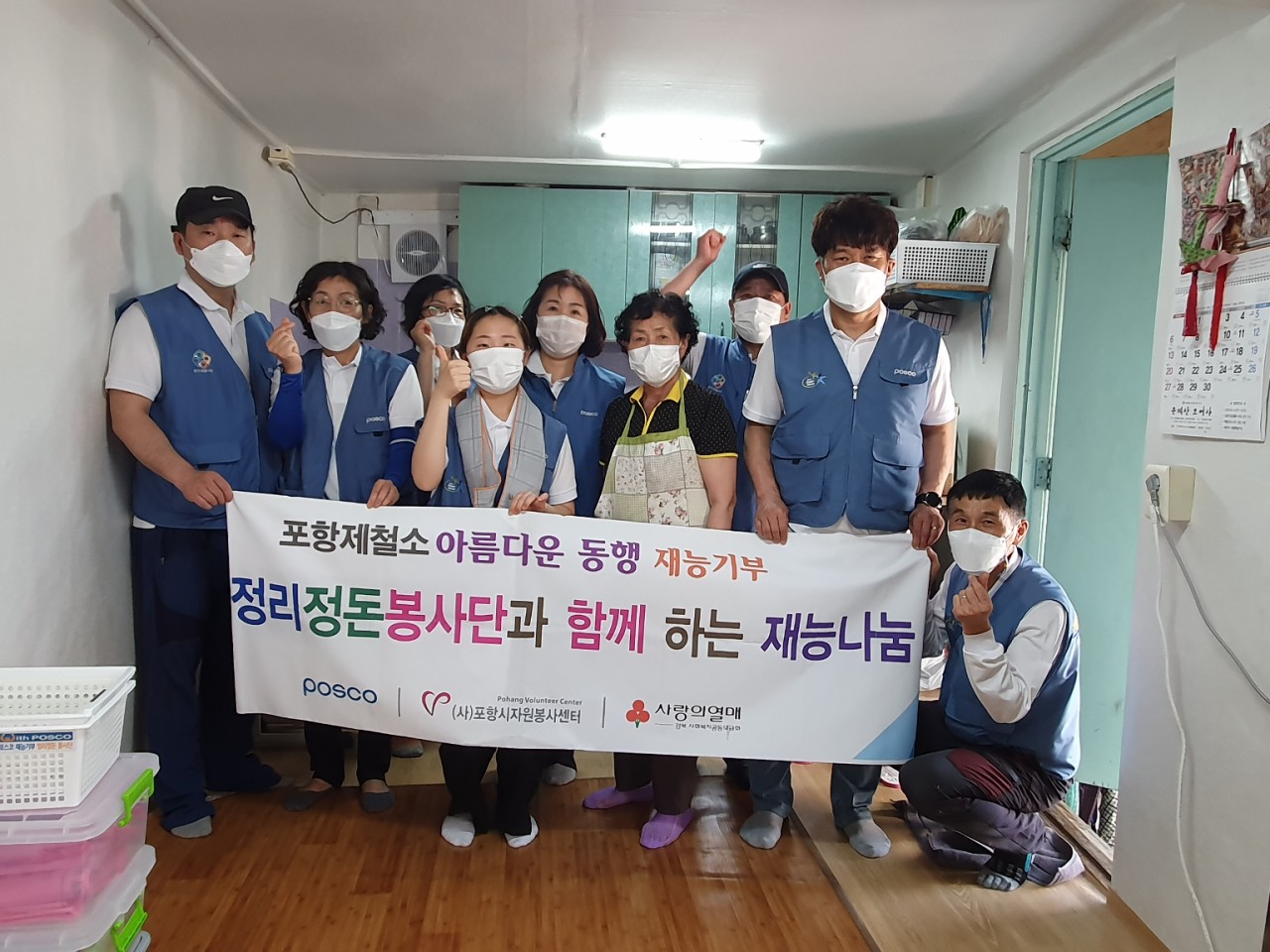 - 일시 : 2021. 6. 6.(일) 13:00~16:00 - 장소 : 남구 동해안로 5932번길 17 - 대상 : 포스코 재능 정리정돈 봉사단(리폼봉사단, 정리정돈봉사단) - 내용 : 할머니와 학생이 살고있는 남구 동해안로 한가정에 리폼 봉사단이 오전에 방문하여 장판교체와 도배를 마무리 하였고, 오후에는 정리정돈 봉사단이 봉사활동을 이어갔다. 1)주방 청소와 정리정돈, 2)침실방 침대 위치변경 및 재배치, 3)헹거구입 하여 설치, 4)TV 위치변경, 5)옷장 정리정돈 및 위치 변경, 6)신발장 구입 정리정돈 순으로 진행이 되었고 이후 집집안 구조에 적절하고 보다 이용이 편리하게끔 맞춤식 정리정돈이 진행되었다. (사)포항시자원봉사센터 홍보기자 정순택 |