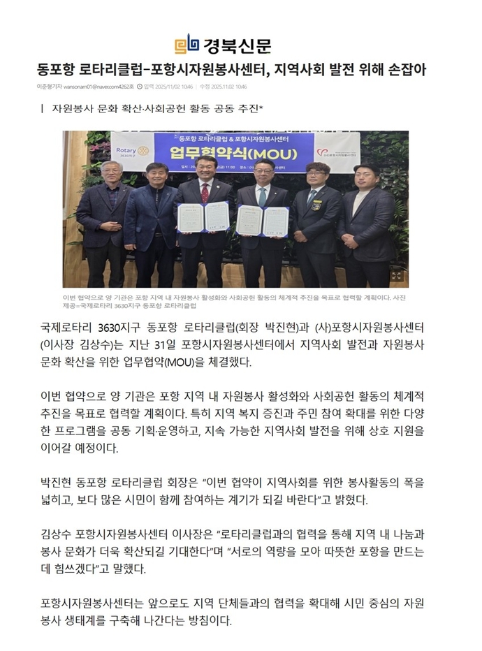 동포항 로타리클럽–포항시자원봉사센터, 지역사회 발전 위해 손잡아.