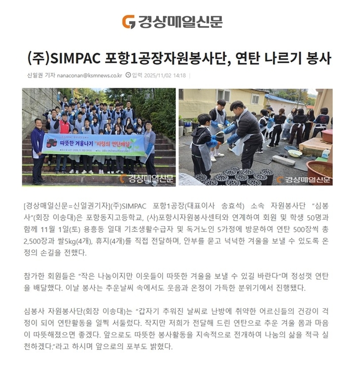 (주)SIMPAC 포항1공장자원봉사단, 연탄 나르기 봉사