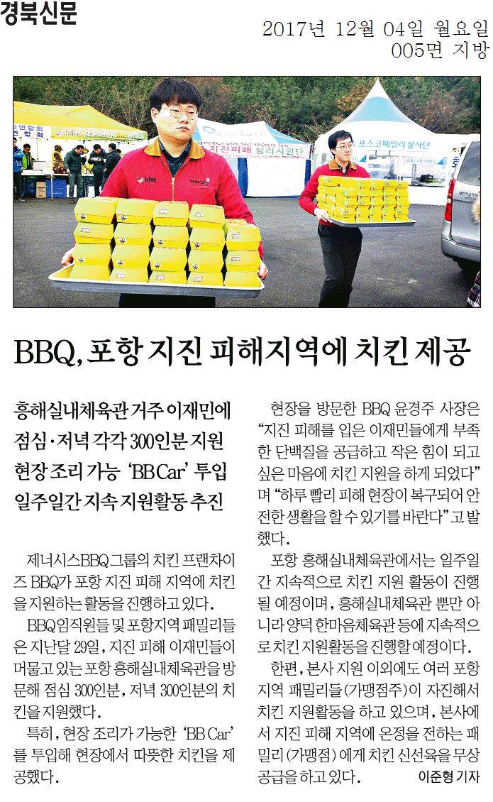| BBQ, 포항 지진 피해지역에 치킨 제공 | |||