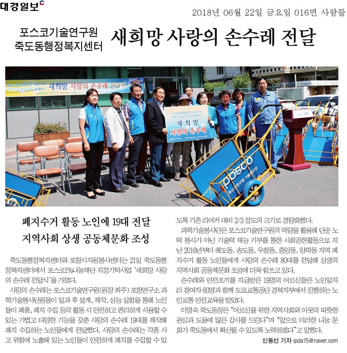| 포스코기술연구원 죽도동행정복지센터 새희망 사랑의 손수레 전달 | |||
