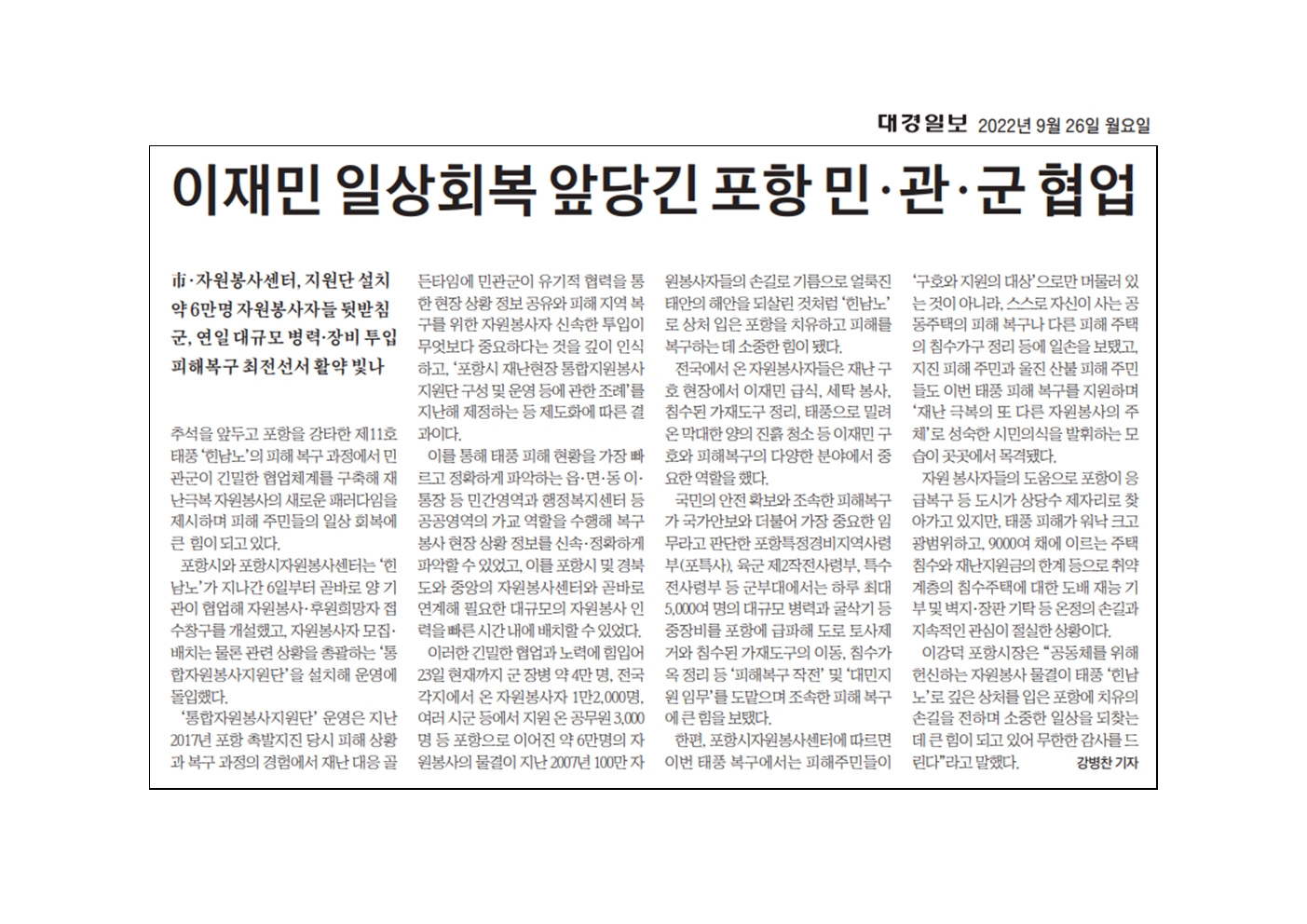 | 제11호 태풍 힌남노 피해복구활동 총력 | |||
