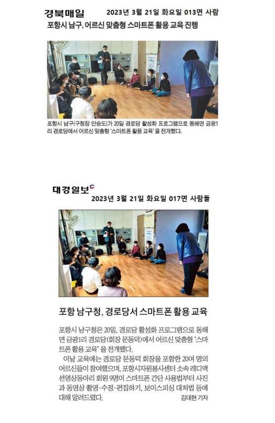 [경로당 자원봉사단] 단체명 : 레디액션 영상 동아리 일시 : 2023년 3월 20일(월) 장소 : 포항시 남구 동해면 금광1리경로당 |