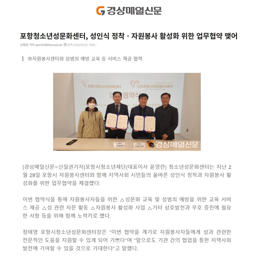 | 포항청소년성문화센터, 성인지 정착-자원봉사 활성화 위한 업무협약 맺어 | |||