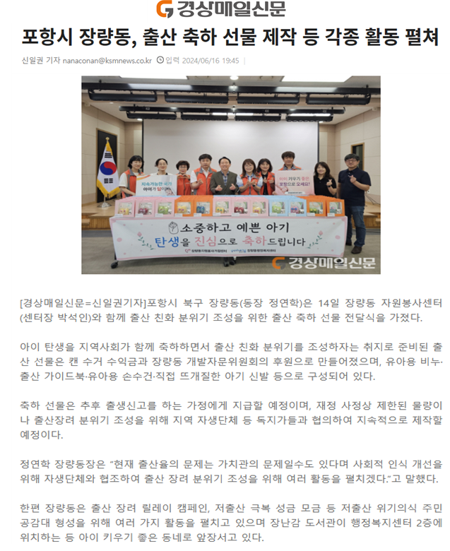 | 포항시 장량동, 출산 축하 선물 제작 등 각종 활동 펼쳐 | |||