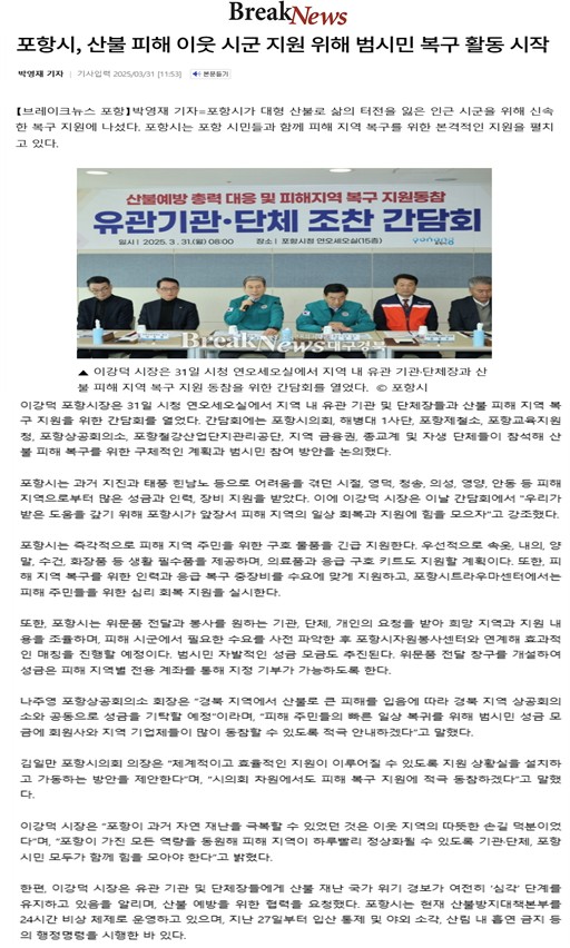 | 포항시, 산불 피해 이웃 시군 지원 위해 범시민 복구 활동 시작 | |||