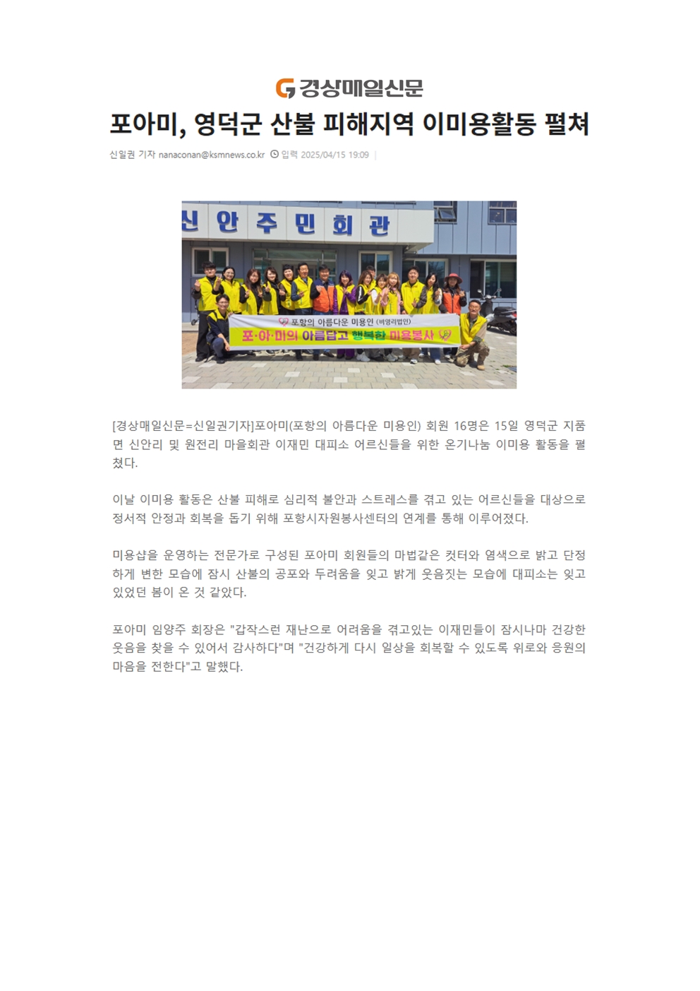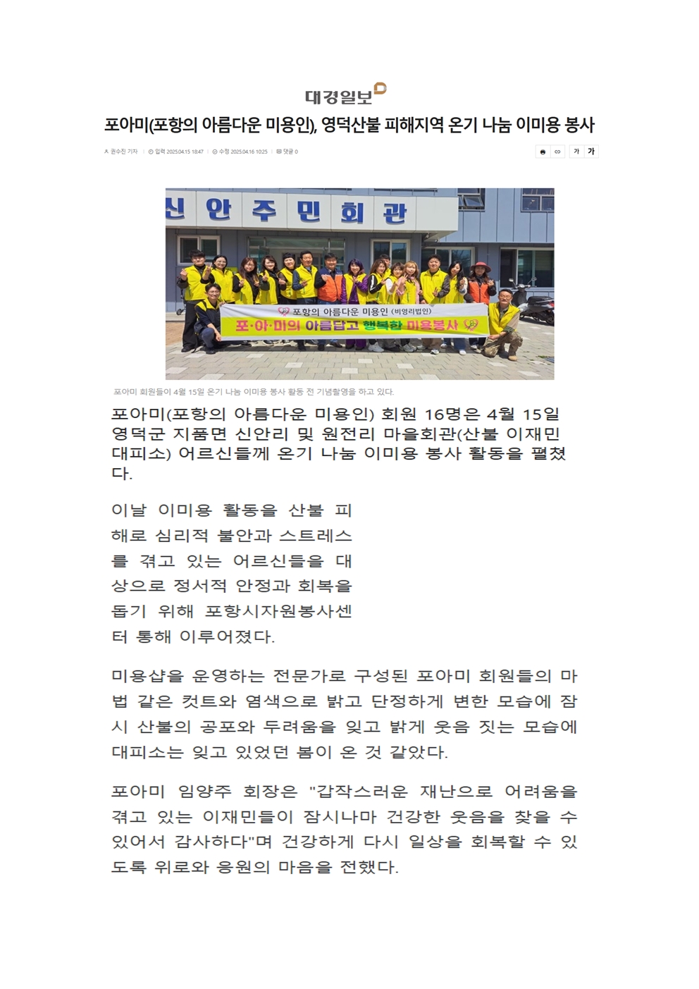 | 포아미(포항의 아름다운 미용인), 영덕산불 피해지역 온기 나눔 이미용 봉사 | |||
