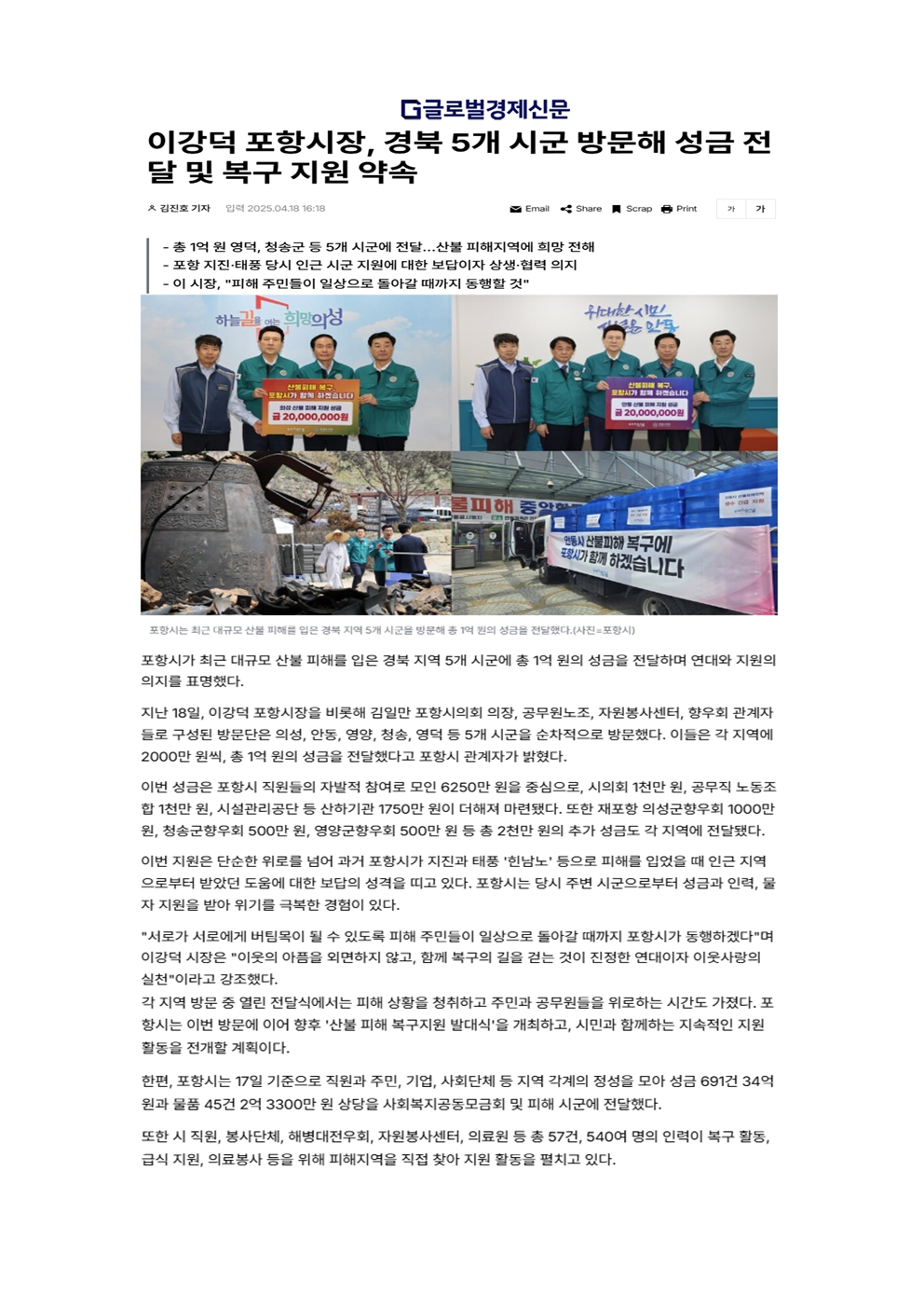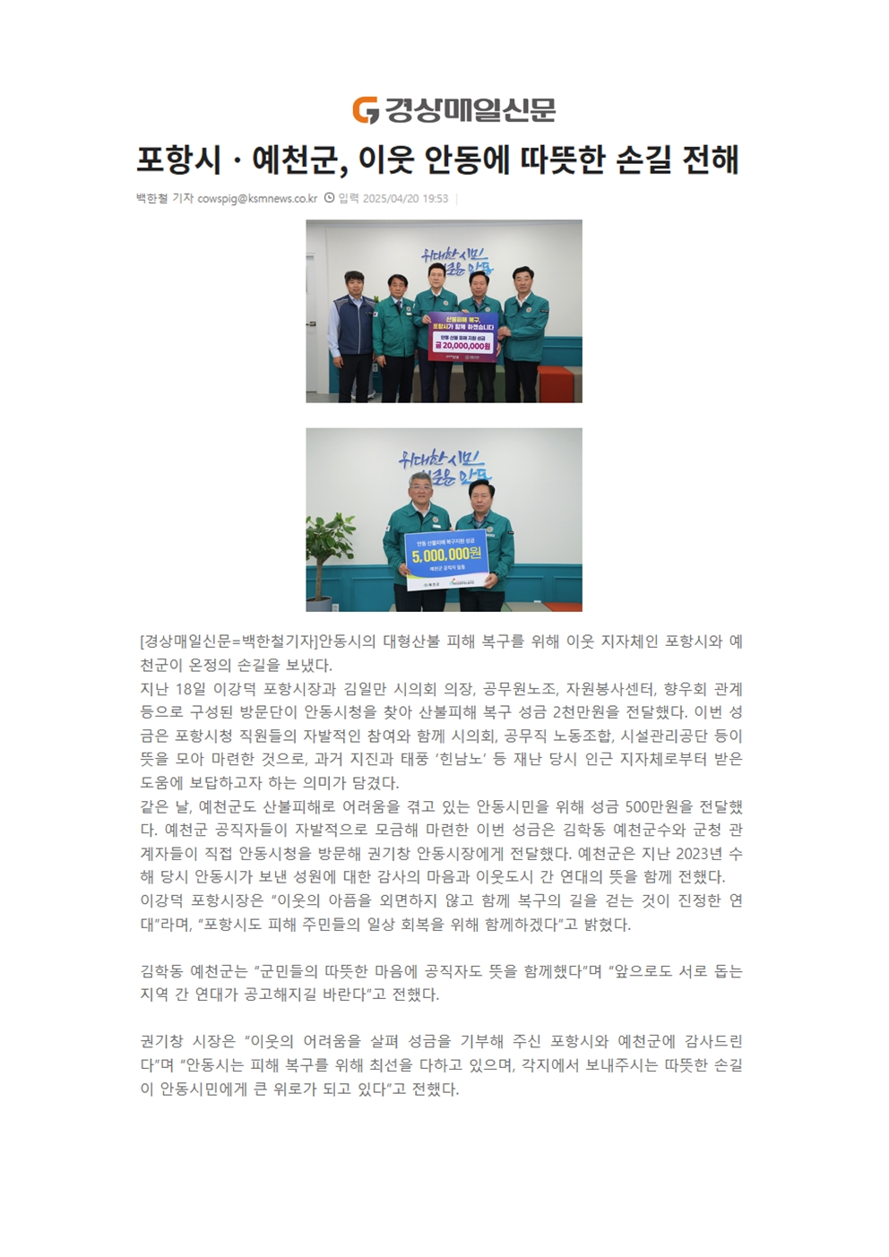 | 포항시ㆍ예천군, 이웃 안동에 따뜻한 손길 전해 | |||
