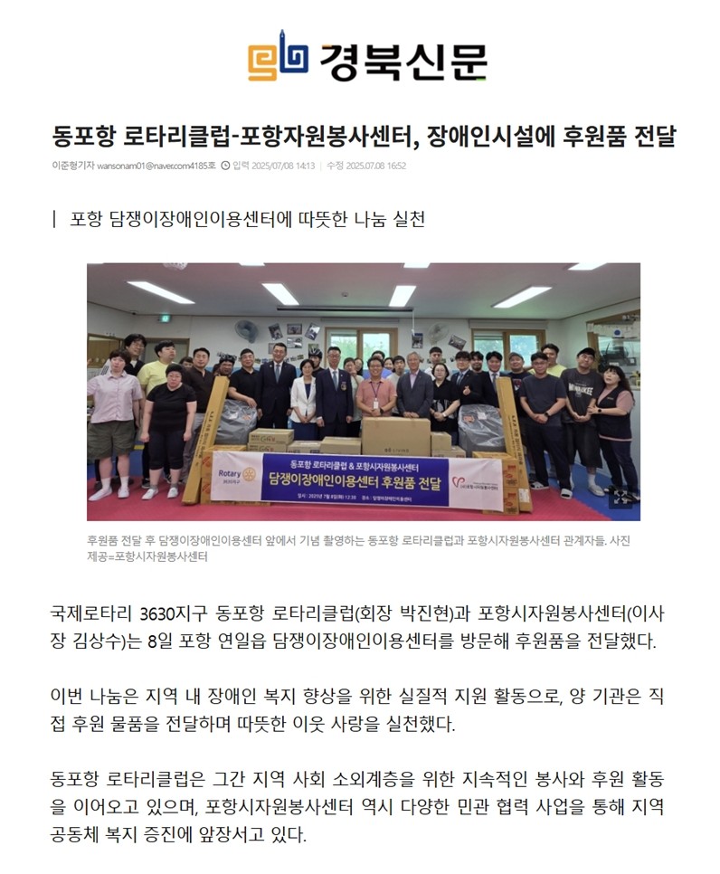 | 동포항 로타리클럽-포항자원봉사센터, 장애인시설에 후원품 전달 | |||